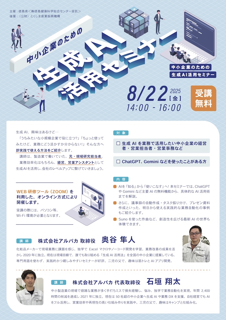 株式会社アルパカは、2025年8月22日(金)に開催される「中小企業のための生成AI活用セミナー」に登壇します。主催は徳島県、運営は徳島健康科学総合センター。AIやDXに関心はあるけれど「何から始めれば?」と感じている中小企業の皆さまへ現場発のリアルな体験とすぐに使えるノウハウをオンラインで全国にお届けします。